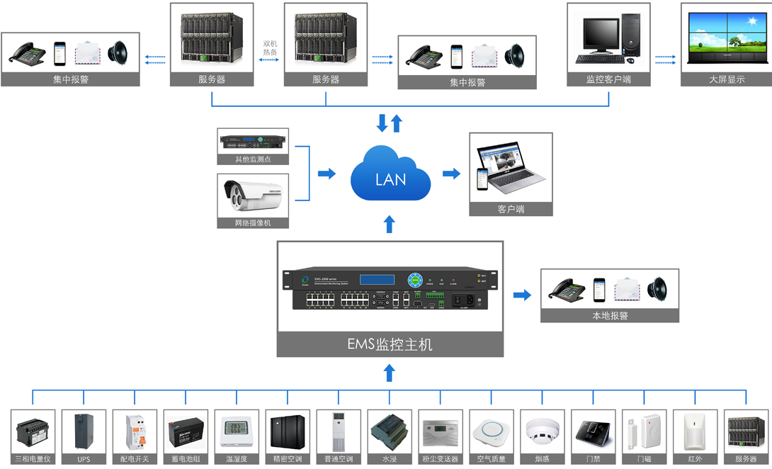 EMS系列監控主機主要用以采集數據、處理數據,可對環境、運行負載、設備溫升、局放工況、安防、視頻、消防、智能設 備等進行一體化監控。在實際應用中,與不同類型的傳感器相連,布線簡潔,操作方便。